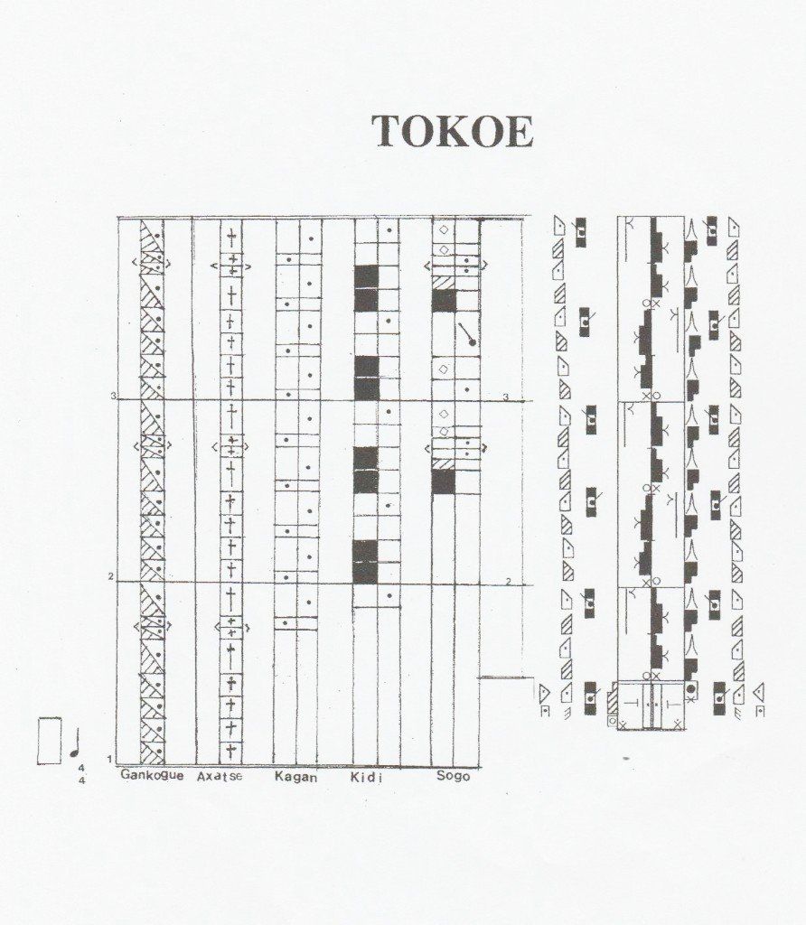 Tokoe Is a dance that originated among the GA people. Around 1964/65, Appiah Kubi a GA person, shared this dance with C.K. Ganyo and Vincent Ladzekpo while they were members of the Workers Brigade Cabaret Troupe. It was originally a puberty dance. Today it is a popular dance among the Ewe people of Ghana. This dance is connected to DIPO - the female rite of puberty. During the early seventies, this dance was performed frequently, but it was not being performed with great frequency in the early 2000s. The students wanted the dance to be documented. I was sent to Ghana to teach performers and students how to write dance on the computer in order to have a written record of the dance, and to document the culture. When the archive of integrated notated scores is erected, TOKOE will be the inaugural score exhibited.